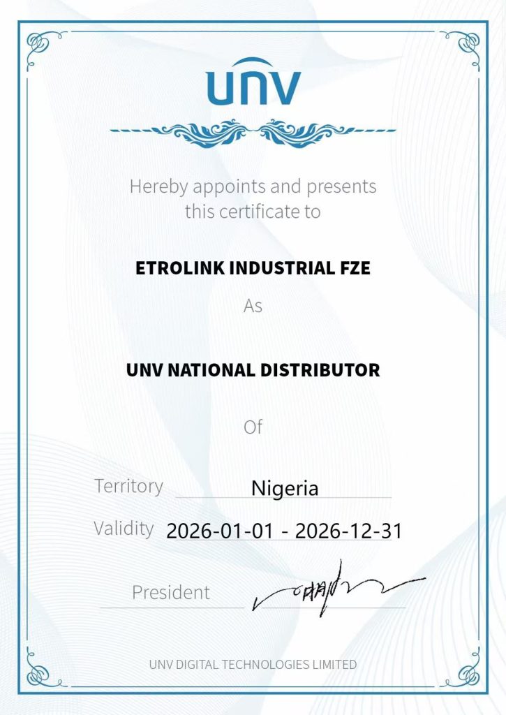 We are proud to announce that Etrolink Industrial has officially been certified as a National Distributor for Uniview (UNV) in Nigeria. This partnership marks a strategic alignment between Uniview’s world-class IP video surveillance solutions and Etrolink’s robust distribution network and technical expertise.